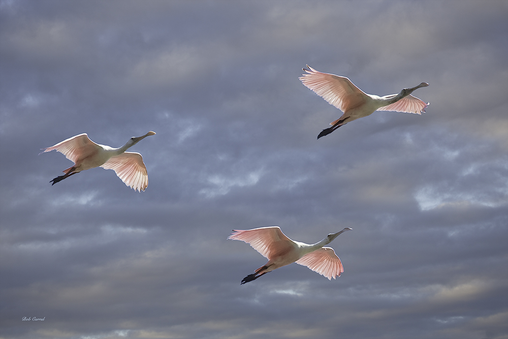 Flight of Three Published March 9, 2014 at 1000 × 667 in Flight of Three #337 photo,Three Roseate Spoonbills in Flight, St Augustine Alligator Farm, St Augustine, FL
